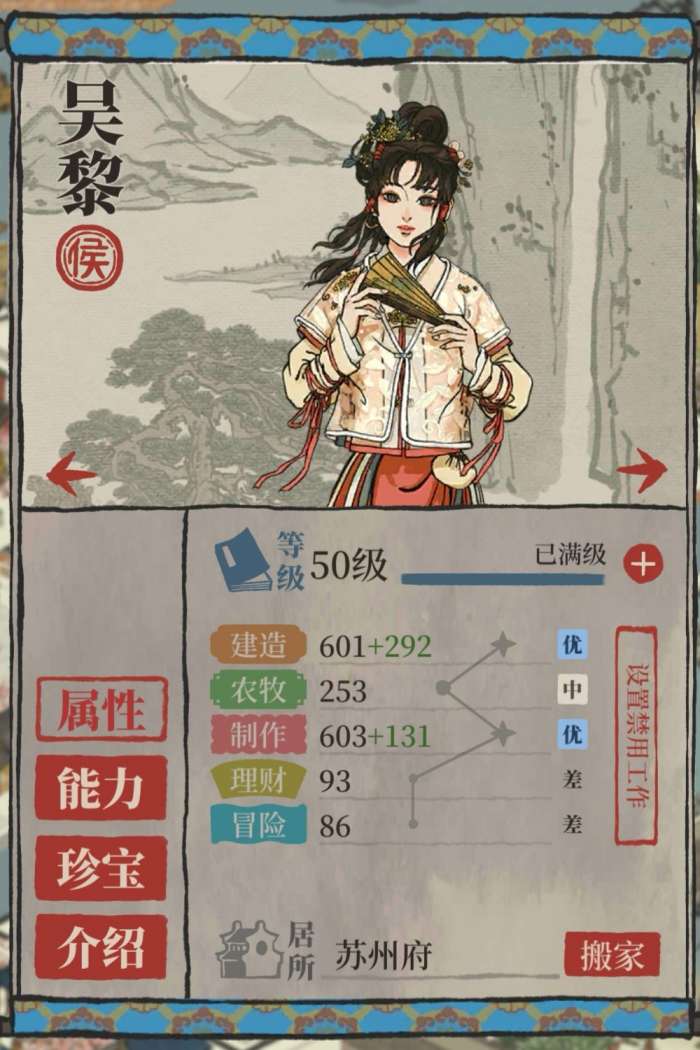 吴黎,升级建筑立即减少20%时间,属性优,但是加上能力,不比天级人物属性特差。升级琉璃塔,东园首选。升级建筑很好用。