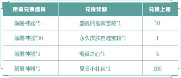 参与三分夏日之蔷薇珍宝阁系列活动,通过累计登录、每日对局、乘风破浪收集活动道具解暑神器,解暑神器可用来免费兑换盛夏的蔷薇宝藏(几率得内测皮肤)、蔷薇之心、永久皮肤自选宝箱等奖励!(商城特惠将在8月18日~8月23日开启售卖,每人限购解暑神器*6,每个售价钻石*60。)