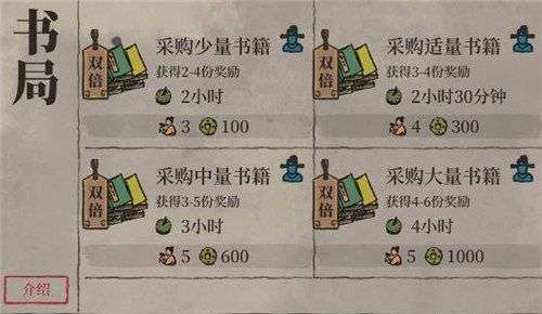 2、在书局中每天的第一次会有双倍加成的效果,如果升到满级,第一次将会获得等多的书籍。