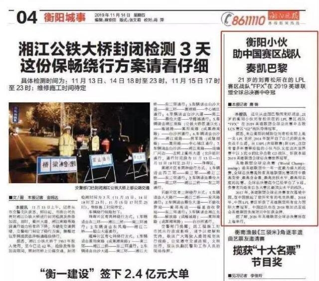 LWX此次被家乡报纸报道,无疑让大家看到了传统媒体对于电子竞技在逐渐的认可,而现在又有一位FPX的队员上了报纸,就是刘青松,刘青松登上了《衡阳晚报》,新闻题目是《衡阳小伙助中国赛区战队奏凯巴黎》。