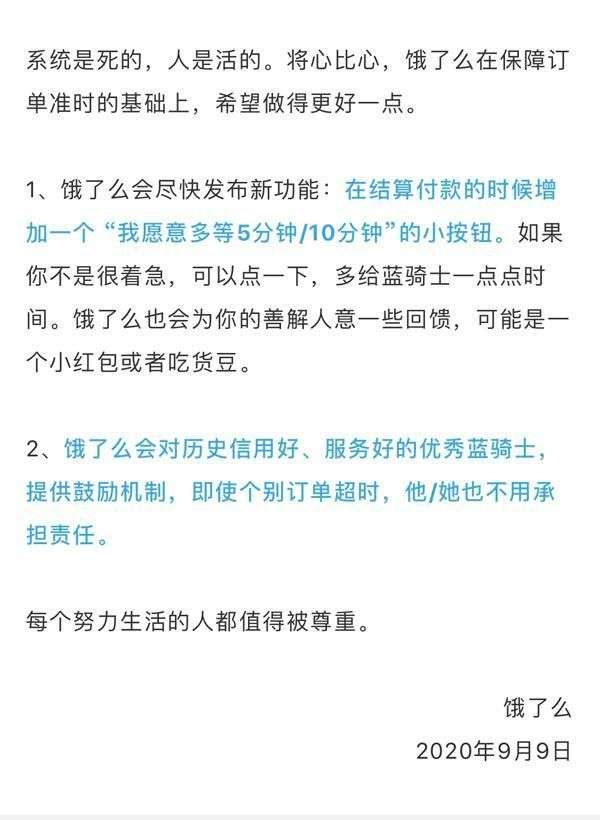 9月9日凌晨,饿了么官微发文《你愿意多给我5分钟吗?》,宣布将发布新功能:在结算付款的时候增加一个 “我愿意多等5分钟 /10分钟”的小按钮。如果你不是很着急,可以点一下,多给骑手一点点时间。