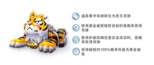 作为百兽之王,虎王拥有极具特色的专属攻击道具:虎王导弹会使被击中的敌人受到减速、虎爪印遮挡和大魔王效果。