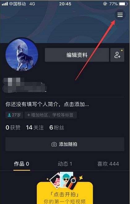 1、首先打开抖音app,然后点击右下角“我”,进入个人页面后点击右上角的图标。