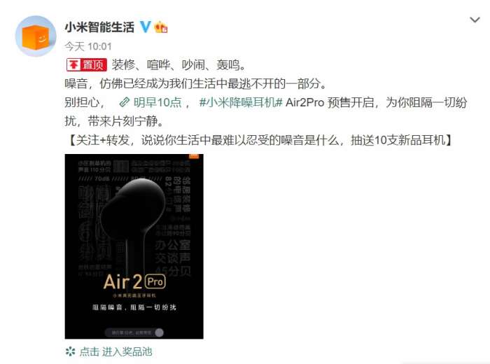 小米首款真无线降噪耳机终于来了!装修、喧哗、吵闹、轰鸣……噪音,仿佛已经成为我们生活中最逃不开的一部分。小米智能生活官方微博发文称,明天(10月13日)上午10点,小米降噪耳机Air2 Pro开启预售,“为你阻隔一切纷扰,带来片刻宁静。”