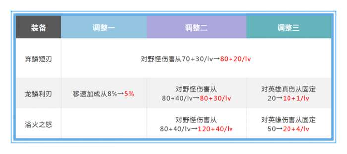 - 龙鳞利刃——削弱:移速降低3%,对野怪伤害成长降低10点,对英雄伤害前期也大幅度削弱(超过10级后加强了一点点)。