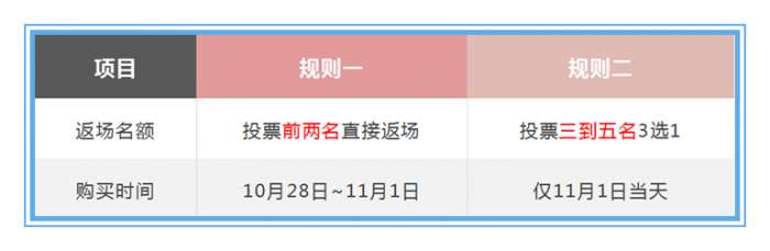 投票前两名的限定皮肤可以直接参与返场;投票3到5名的皮肤,玩家们可以3选1进行购买。