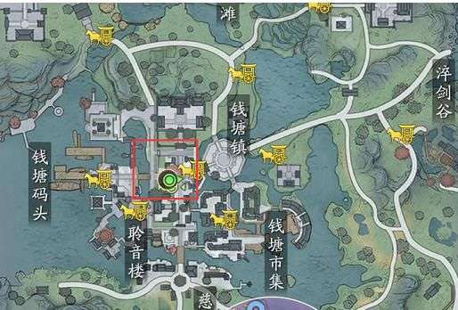 江南(377,516),钱塘镇的左下角,聆音楼右上角。
