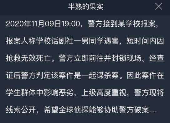 crimaster半熟的果实答案到底是什么呢,这个案件死者是个男生,首先从主题来了解案件类型哦,半熟的果实看似跟校园爱情有关哦,看似恋人又是恋人未满的样子,嫌疑人有4个,到底谁会是凶手呢,现在就来告诉给各位吧~