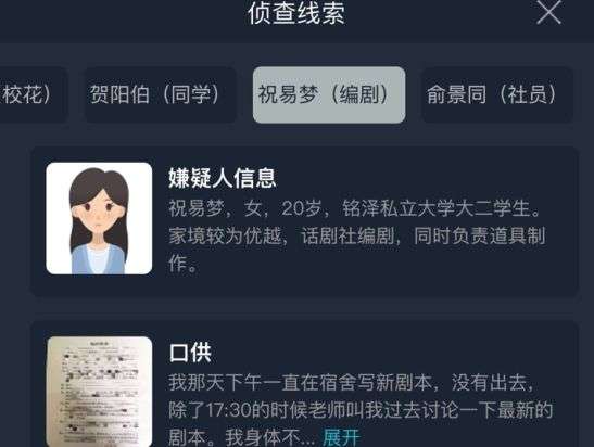 嫌疑人内容:毕漪寒(校花)贺阳伯(同学)、祝易梦(编剧)、穆星辰(社员)