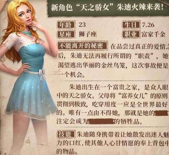 个人技能:魅力:朱迪随身携带者让她散发出迷人魅力的口红,使他人心甘情愿的奉献上背包中的物品,对他人使用时,可以随机获得对方背包一件物品。不管对于幸存者还是迷失者,都是窃取神技,拿到对手药包,可以加一滴血,拿到风眼石,可以开风暴等。
