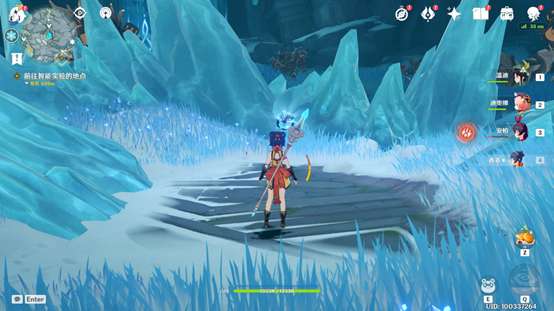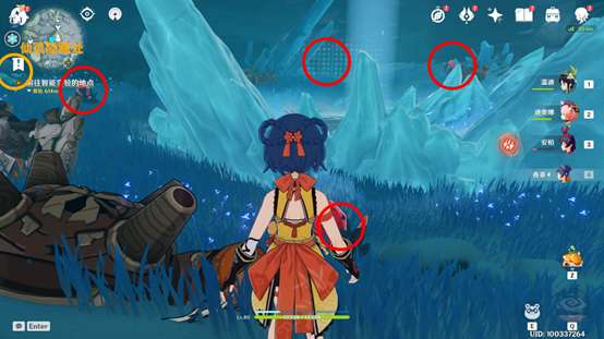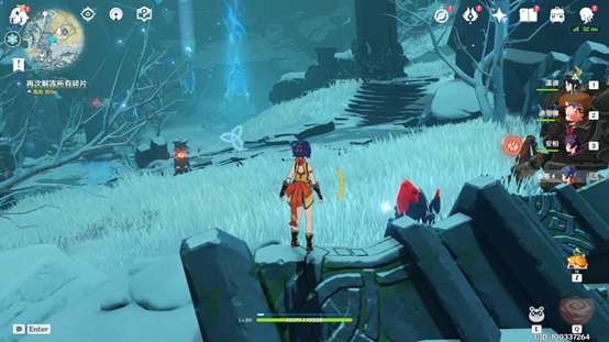 中央的红石在栅栏后,需要找到两个仙灵归位才能开启。其中一个在坚冰高处,较为明显,另一个隐藏在图中的雪堆处,用火元素攻击融化雪堆即可使仙灵归位。