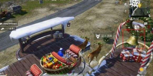 首先我们进入新出的冰雪模式中,在地图中会有驯鹿图标,这些位置就是有驯鹿车的站点,在这点这里会有很浓的圣诞气息,摇动如图所示处的铃铛就能够召唤出驯鹿车了。