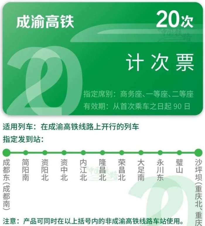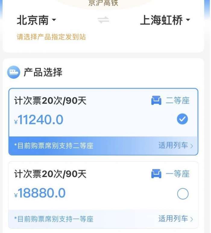 另外京沪高铁沿线的一些区间站也可以购买,比如北京南站到济南站,二等座计次票 20 次 / 90 天售价 3780 元,平均每次票价为 189 元;一等座计次票 20 次 / 90 天售价 6340 元,平均每次票价为 317 元。