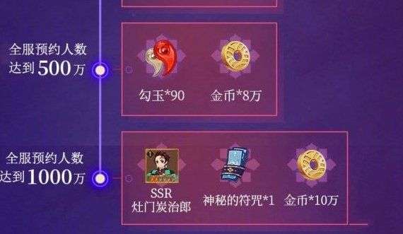 阴阳师大人们可前往官网完成预约,当预约的阴阳师大人总数分别达到50万、200万、500万、1000万时,将免费获得SSR灶门炭治郎契约书等对应梯度的全服预约奖励。
