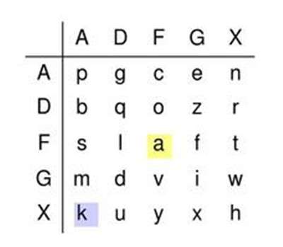 看到这个字符表格之后初步推测应该是棋盘密码,也即Polybius密码,而且ADFGX 密码类型,可以将对应的字符转化为数字的组合。