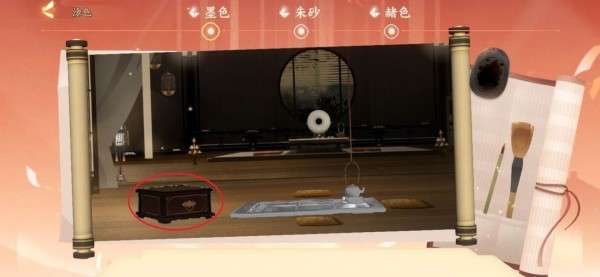 5.之后再去跟曹植互动,蘸取他面前的颜料后,他会叫我们帮忙修复中间和右边的屏风,修复的同时按照正常流程走,我们会获得3种可以制成颜料的素材石。(一开始获得的墨色只能画下图圈起来的两块位置)