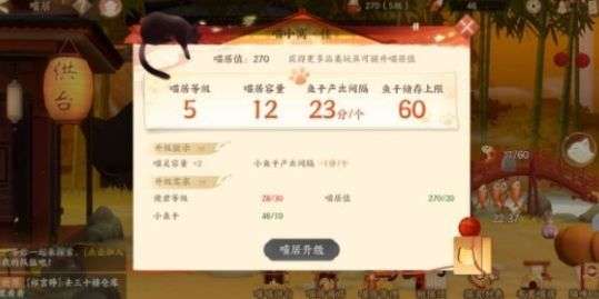 点击【喵居管理】界面即可了解当前喵居等级、可容纳猫咪上限、生产小鱼干速度等喵居详情,喵居的等级决定着可容纳猫咪数量的上限,因此想要吸引更多的猫咪入住,