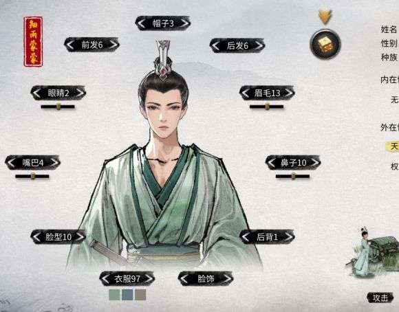 男性:嘴巴4、脸型10、衣服97、脸饰、后背1、鼻子10、眉毛13、后发6、帽子3、前发6、眼睛2