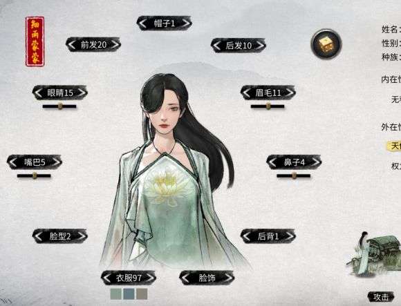 女性:嘴巴5、脸型2、衣服97、脸饰、后背1、鼻子4、眉毛11、后发10、帽子1、前发20、眼睛15