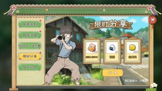 成长过程中别忘了给自己的小家留个影,解锁拍照功能后,通过拍照分享活动,分享照片给朋友们可获得超级土豆种子、饭团和金贝壳,成长基金又多了一笔~