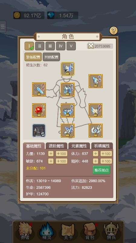 3、 前期不建议给自己的装备升级啊什么的,挂机的时候重复刷图,也能刷到比较好的装备,所以省点钱到花在精灵和技能提升这方面更实在,法强后期也很重要,因为技能升到顶级之后,耗蓝都是好几万好几万的。