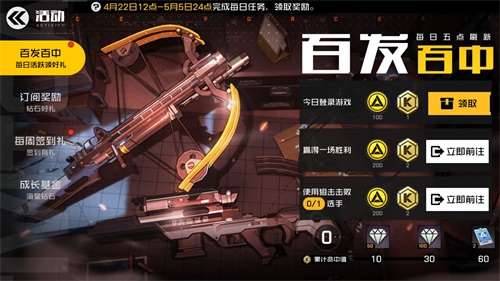 4月22日12点-5月5日24点,活动期间完成对应的活动任务可以获得命中值,累积一定数量的命中值可兑换活动奖励:钻石、熟练度加速卡,你是否是王牌神枪手呢呢?那就试一试吧!