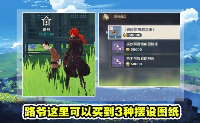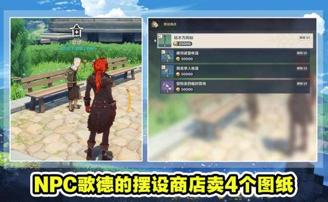 其实游戏中有七张隐藏的家具图纸,它们分布在两个NPC商店中,而且这两个NPC的位置非常不起眼,不注意根本找不到。第一个NPC位于蒙德城西风骑士团门口草地的椅子上,可以发现一个叫做歌德的NPC,他是蒙德城歌德大酒店的老板,与他对话后发现,他居然有卖4张家具图纸,分别是枯木方向标、硬顶避雷帐篷、简易单人帐篷和冒险家的临时营地,价格还挺贵的,全部买完需要花费175000摩拉。