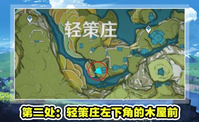 然后是第二处NPC,位于轻策庄左下角的木屋前,可以看到一个叫做路爷的NPC,他是这处工坊的主人,地方有点偏,大家可以按照下面的地图来寻找。