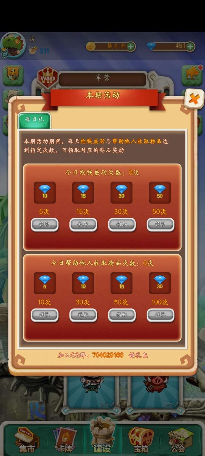 先领激活码礼包,100钻+金币等,然后进群!!领300钻!最后五星好评截图领500钻!900钻到手了!然后直接开880钻石的箱子!战力飙升~建造山寨开启你的强盗生涯!