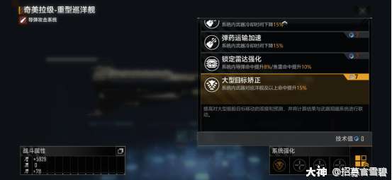 【大型目标矫正】:提高对大型舰船目标移动的观察和预测能力,增加系统内武器对巡洋舰及以上舰船命中率提高15%。增加舰船导弹对大型舰船的命中率,可以更好的打击大型舰船。