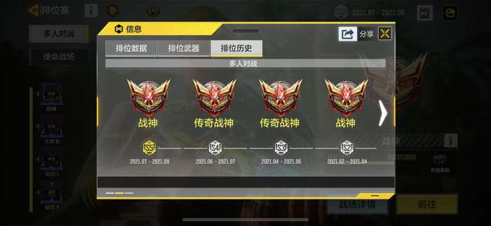 而且,只要战士们在新赛季中打到过一次“传奇战神”段位,那么个人信息里的最高段位即可被刷新为“传奇战神”特有的段位图标。
