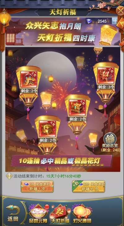 花灯有三种品质:极品花灯,精品花灯,普通花灯。十连抽必中极品花灯或精品花灯。