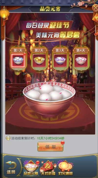 活动期间,每天登录即可领取对应累登天数的元宵好礼。