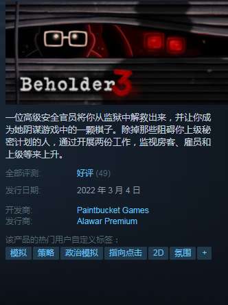 《旁观者3》是Steam上特别好评的反乌托邦游戏《旁观者》的续作。本作中,一位高级安全官员将你从监狱中解救出来,并让你成为她阴谋游戏中的一颗棋子。你需要除掉那些阻碍你上级秘密计划的人,通过开展两份工作,监视房客、雇员和上级等人来达成目标。