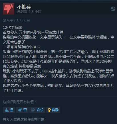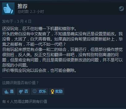 给出差评的人则吐槽本作优化欠佳,汉化机翻,不适宜手柄操作。