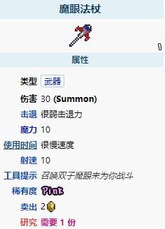 魔眼法杖是困难模式的召唤武器,使用后生成处在第二形态的双子魔眼的迷你版本。