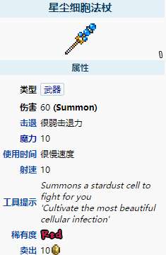 星尘细胞法杖是一件困难模式中电脑独有的召唤武器,它会召唤星细胞(仆从版本的星细胞敌怪)为玩家作战。