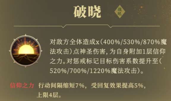 对敌方全体造成x (400%/530%/870%魔法攻击)点神圣伤害,为自身附加1层信仰之力。对惩戒标记目标伤害系数提升至(520%/700%/1220%魔法攻击)。