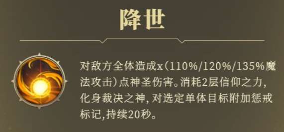 对敌方全体造成x(110%/120%/135%魔法攻击)点神圣伤害。消耗2层信仰之力,化身裁决之神,对选定单体目标附加惩戒标记,持续20秒。