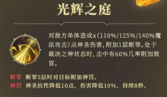 对敌方单体造成x(110%/125%/140%魔法攻击)点神圣伤害,附加1层断罪。处于裁决之神状态时,击中有60%几率附加致盲。