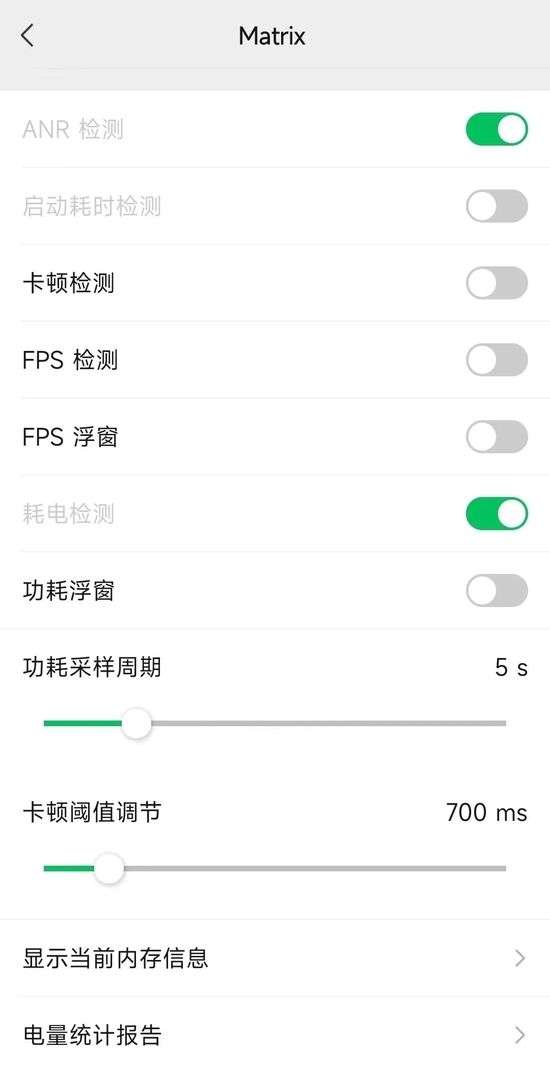 经过以上步骤操作,就会进入Matrix”页面,在这一界面中,微信提供了卡顿检测、FPS(帧数)检测、功耗检测等功能。其中CPU占用率和温度在微信位于后台时依然可用,但帧数监测需要微信位于前台。