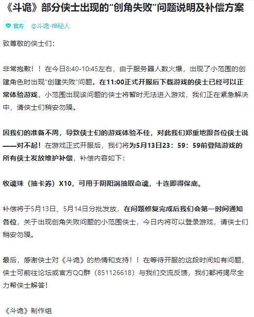 补偿将于5月13日、5月14日分批发放,在问题修复完成后我们会第一时间通知各位,关于出现创角失败问题的小范围侠士,今日内将可以登录游戏,请侠士们稍安勿躁。