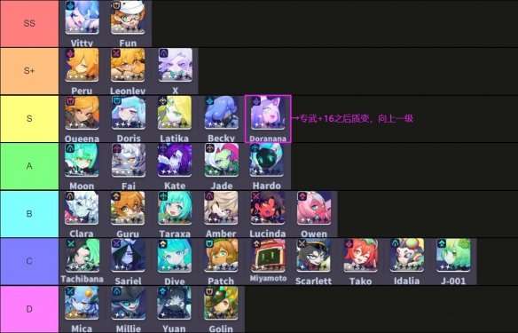 奈奈专16前和专16后基本上属于两个角色。推荐大家开服优先把她的专武升到+16,才能解锁她的完全体——也就是开局满充,可以直接放大招。奈奈的核心就是她的大招召唤的噜噜——一只大猫。这个大猫可以继承奈奈的全部属性,战斗力非常夸张,并且能造成群体击飞(专16后出场时)以及单体击飞(被动),还能瞬移到对面后排(被动)。召唤出来之后基本上等于场上多了个又肉又能抗的重装战士。利用好卡位等摆放角色技巧,可以把大猫用来当前排扛伤,也可以用来当刺客单切对面的c位。而且奈奈本身属于暗系角色,很方便补羁绊。