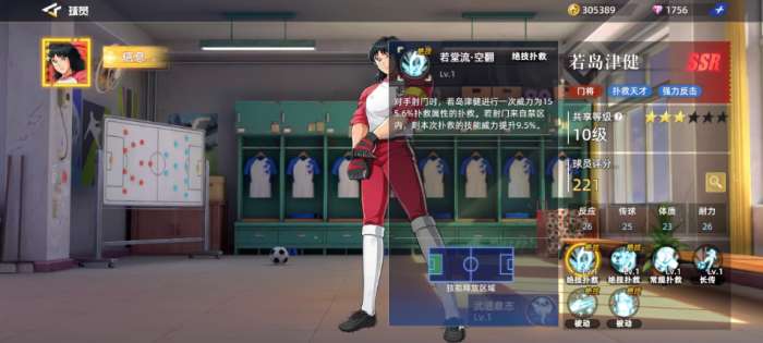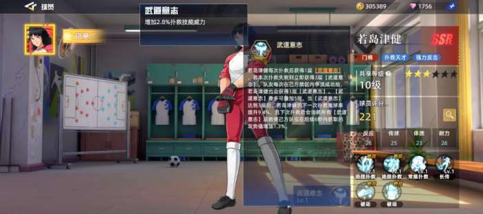如果是希望他扑救属性能够得到足够的增益,其实还是主要靠若堂流·爆发这个技能产生的被动效果,其中会给若岛津健的扑救属性增加3.5%的数值,然后在若岛津健释放扑救技能成功将球扑出后,下次再放扑救技能的时候还会增加8.3%爆发属性,这个效果好用是好用的,就是5秒内只能触发一次,所以要把握好时间,另外的武道鼓舞这个技能会为若岛津健带来反应属性增加3.5%的被动效果,如果是若岛津健使用扑救技能成功将球扑出后,球更容易飞向己方的其他队友,且己方禁区内的所有队友争顶属性也会得到增加6.7%的增益哦。