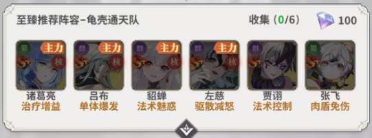 这里的龟壳通天队这个阵容里面大家可以搭配的主力成员有4名,通过吕布、诸葛亮、貂蝉以及左慈的搭配,大家可以看到整体的核心能力当中具有平衡的特点,另外还可以放贾诩跟张飞放在这里,满足大家在防御上面以及各种控制能力上面的需求,而其中大家用到主力成员的时候就会发现,诸葛亮在这里是最为重要的,她虽然只是一个基础的治疗类型角色,但是我方因为在后期输出攻击都比较强势的能力情况下,只有一个防御类型的角色,所以治疗是非常重要的,在这里需求量也非常高,她通过全体的治疗带来的基础技能上有60%的一个数值,所以我方全体在需要回血的时候就基本用她的这个群奶就可以了,另外还可以给全体角色多带来10%的攻击提升,这样的增伤基本是全场都能用的,而另外在升星了以后,她还可以保证释放技能的时候,可以为我方全体的角色带来30%的暴击加成,在这里如果是输出角色的话,是比较需要她这里加成效果的。