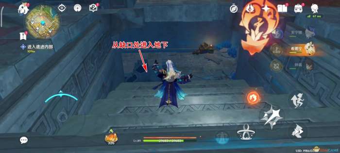 4、在这里可以看到一个缺口,从缺口处一跃而下就可以进入到遗迹内部了。