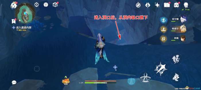 3、从洞窟的位置下去,在如下图所示位置向下跳即可进入任务地点。