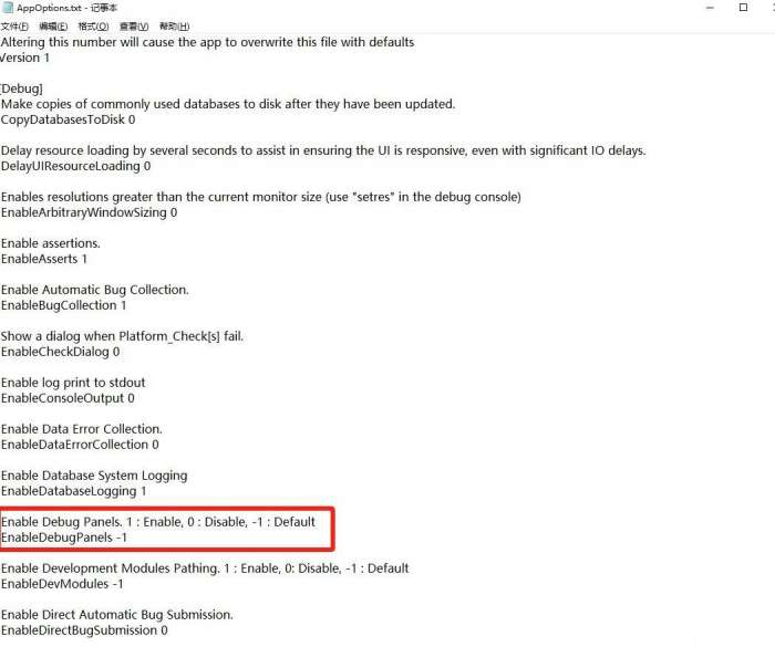 在文档中找到 ;enable debug panels -1这一行,将其改为: