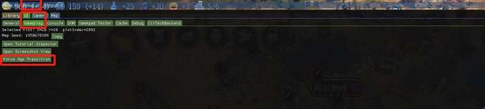 打开控制台,切换到Debug选项,然后找到用户界面(UI) > 游戏玩法(Gameplay),在左下角点击Force Age Transition,即可强制推进时代进程。