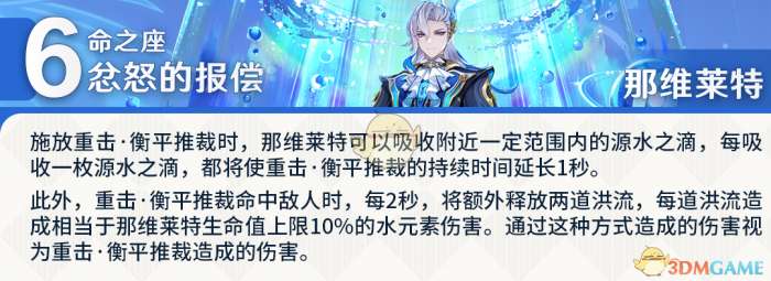 2、6命释放重击时将会吸收附近的源水之滴,增加重击时间,提升输出伤害,命中敌人后还会获得额外的水伤加成。